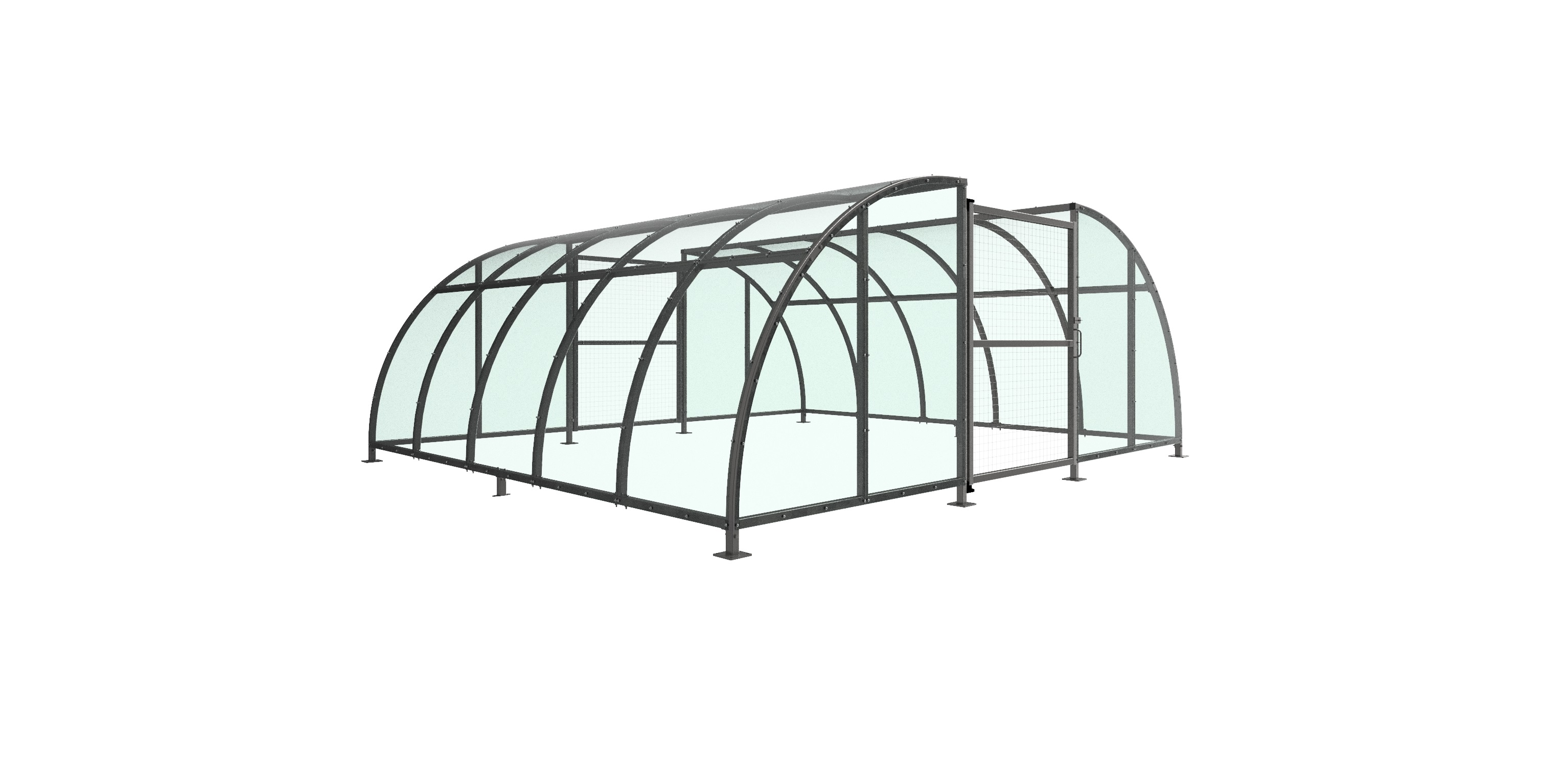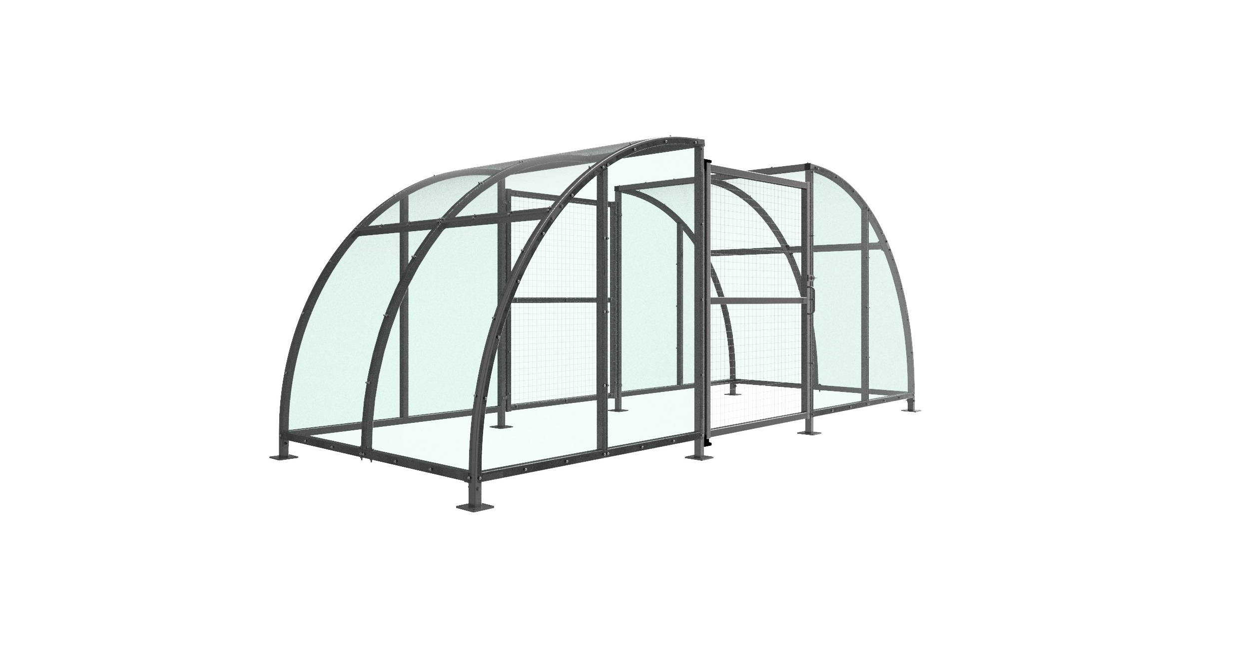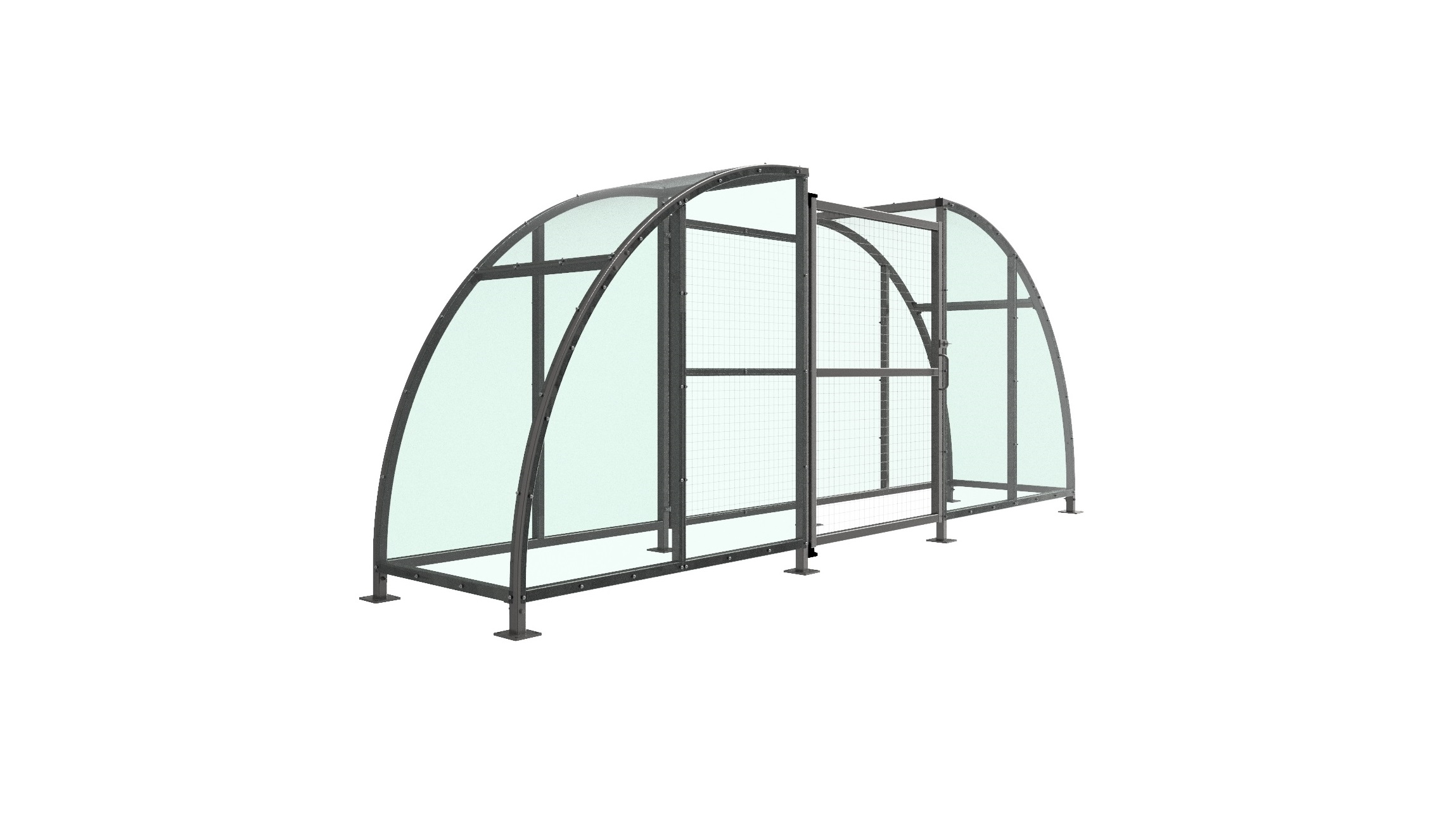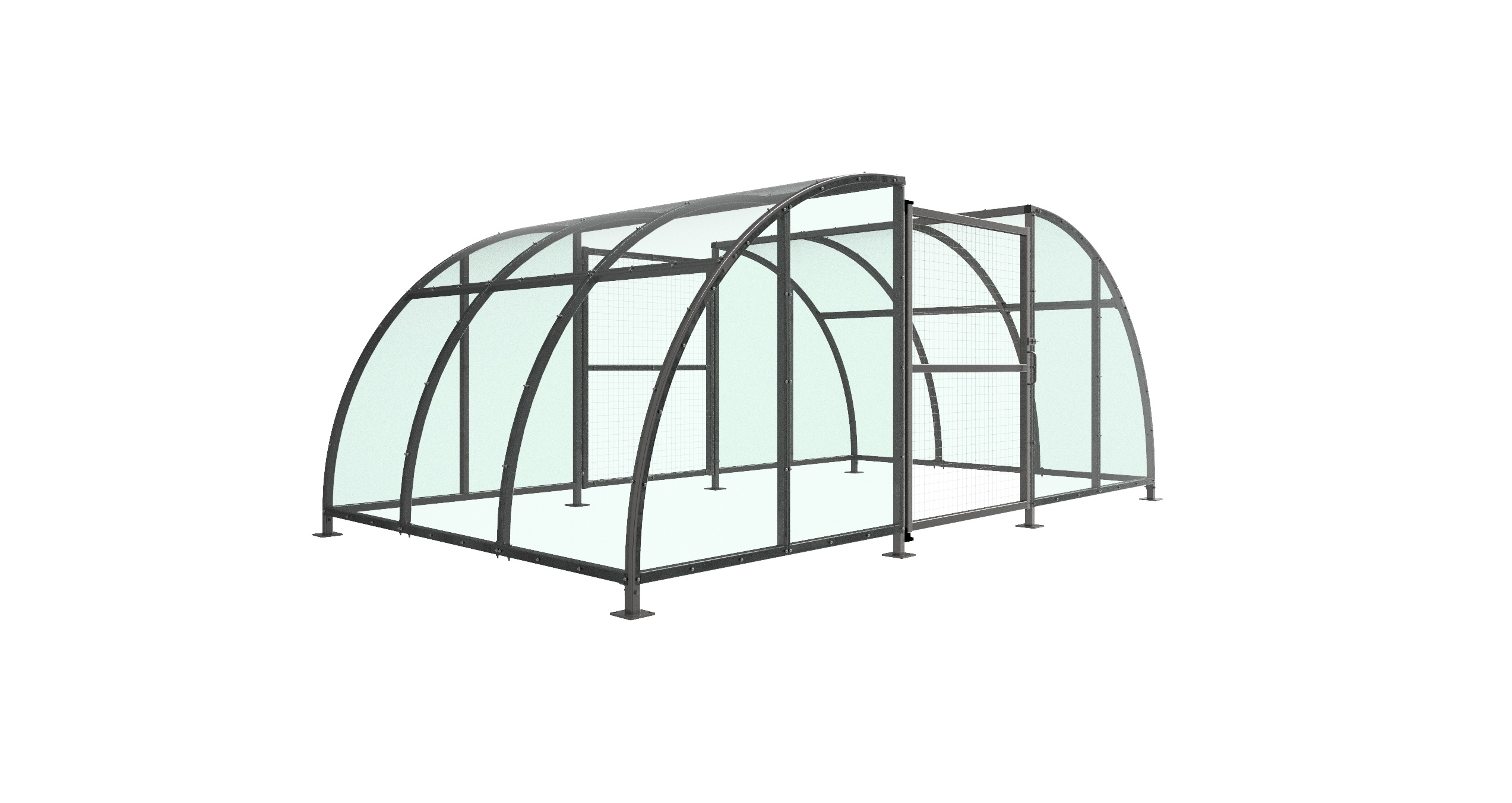 The SCC1 is a variant of the Stratford Compound, and is a free-standing shelter with a Mesh Door lockable by padlock (not included) designed for on site assembly. Constructed from galvanised mild steel, complete with a 4mm PETG clear sheet curved roof and end panels.