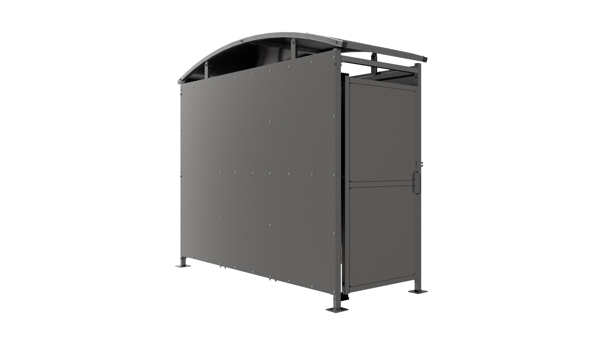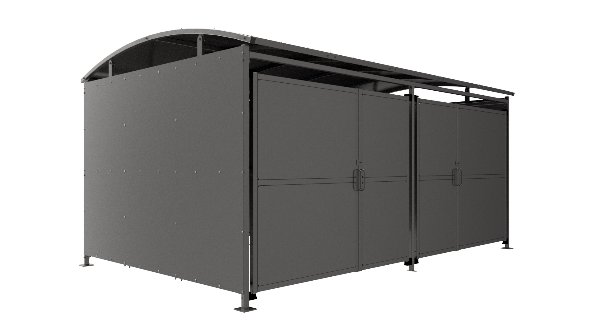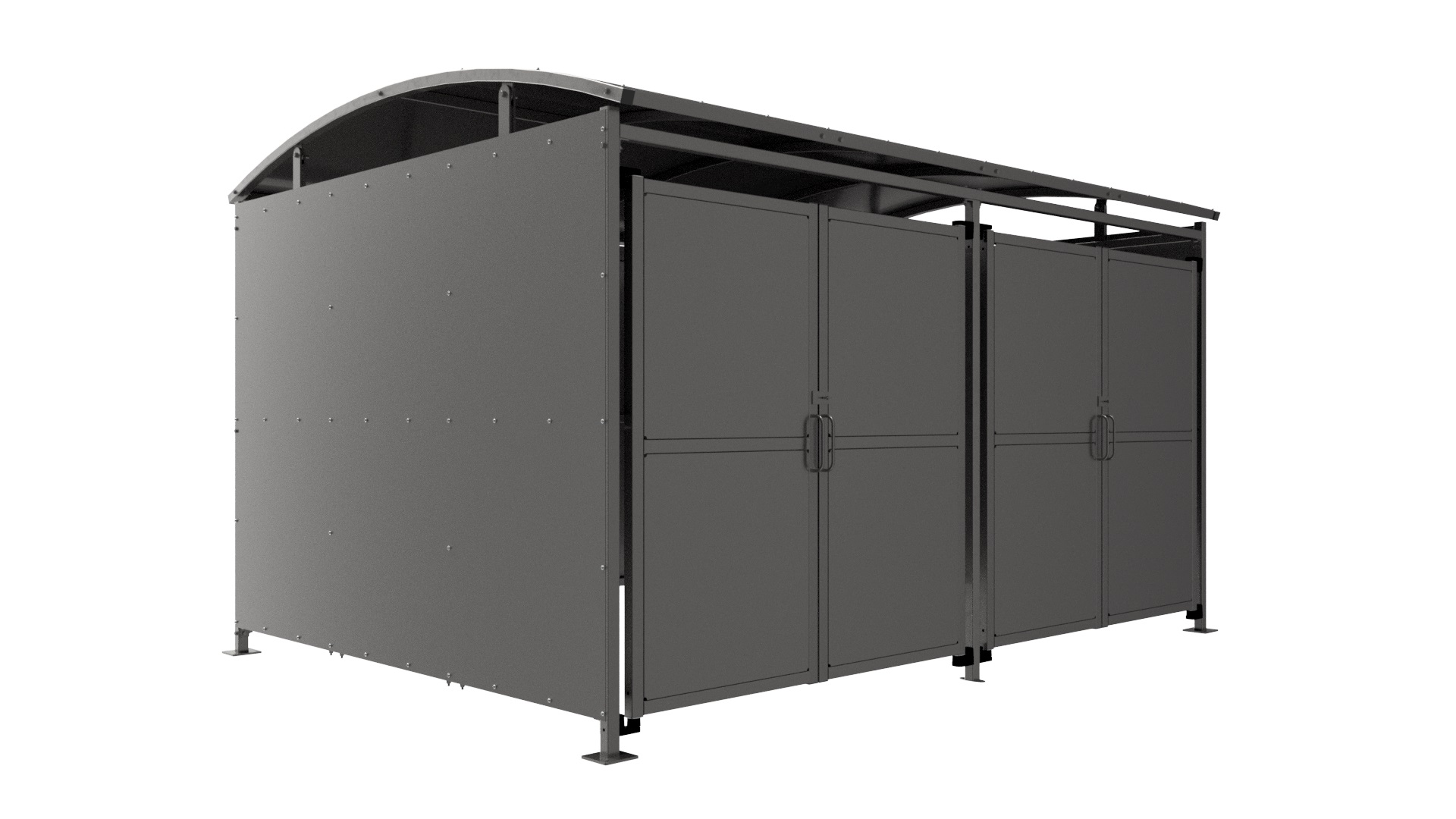 The DM2 variant of the Dodford shelter is a free-standing shelter with Clad Doors lockable by padlock (not included) designed for on site assembly, constructed from galvanised mild steel. Complete with a galvanised sheet curved roof and end panels.