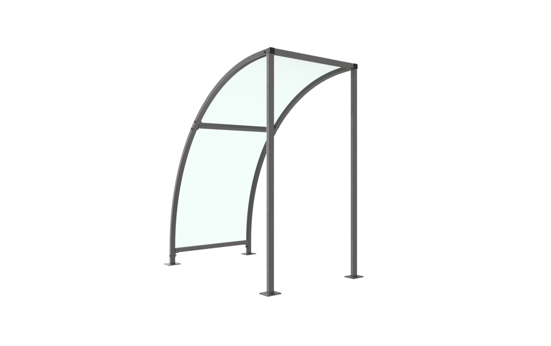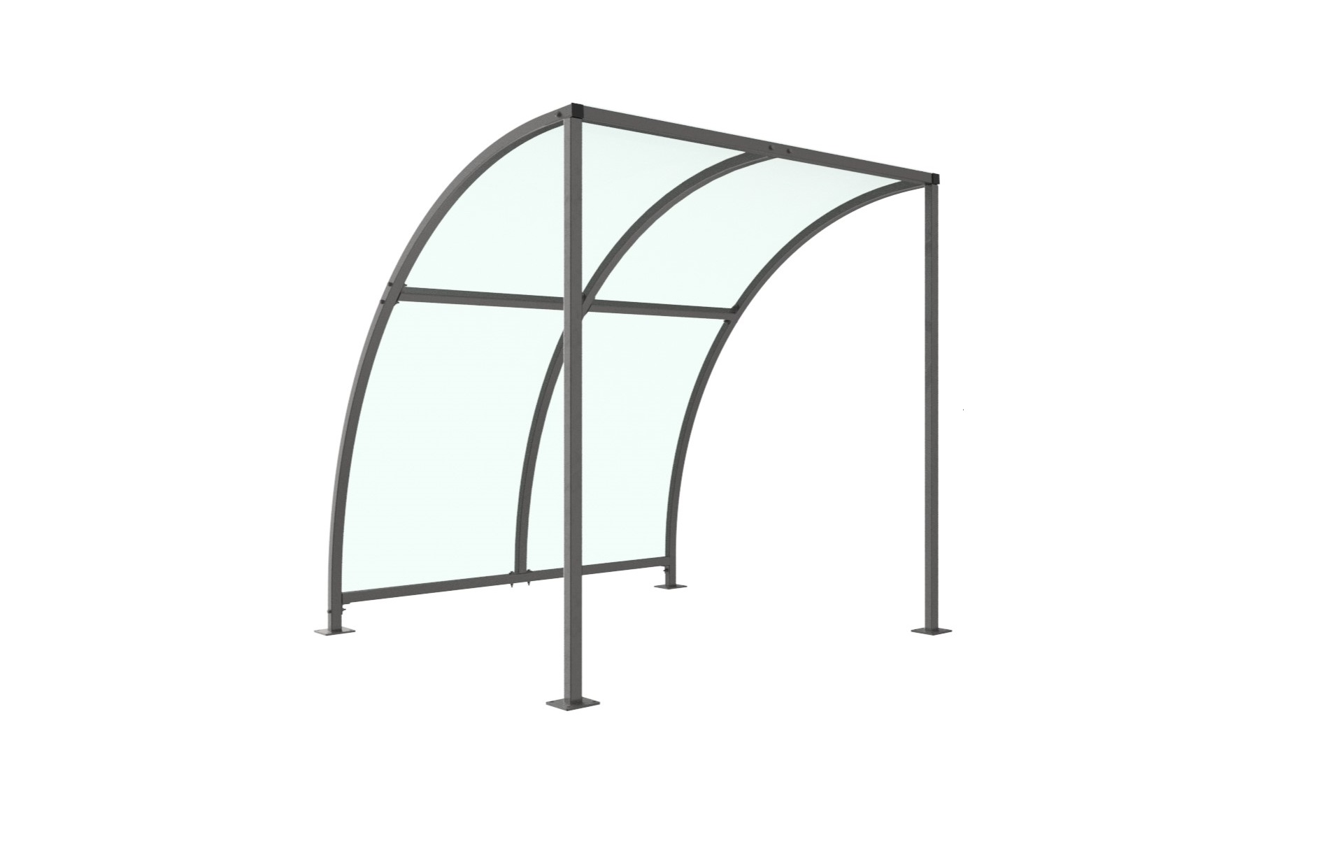 The Leyton shelter is a free-standing, open sided shelter designed for on site assembly, constructed from galvanised mild steel. Complete with a 4mm PETG clear sheet curved roof back, with open ends.