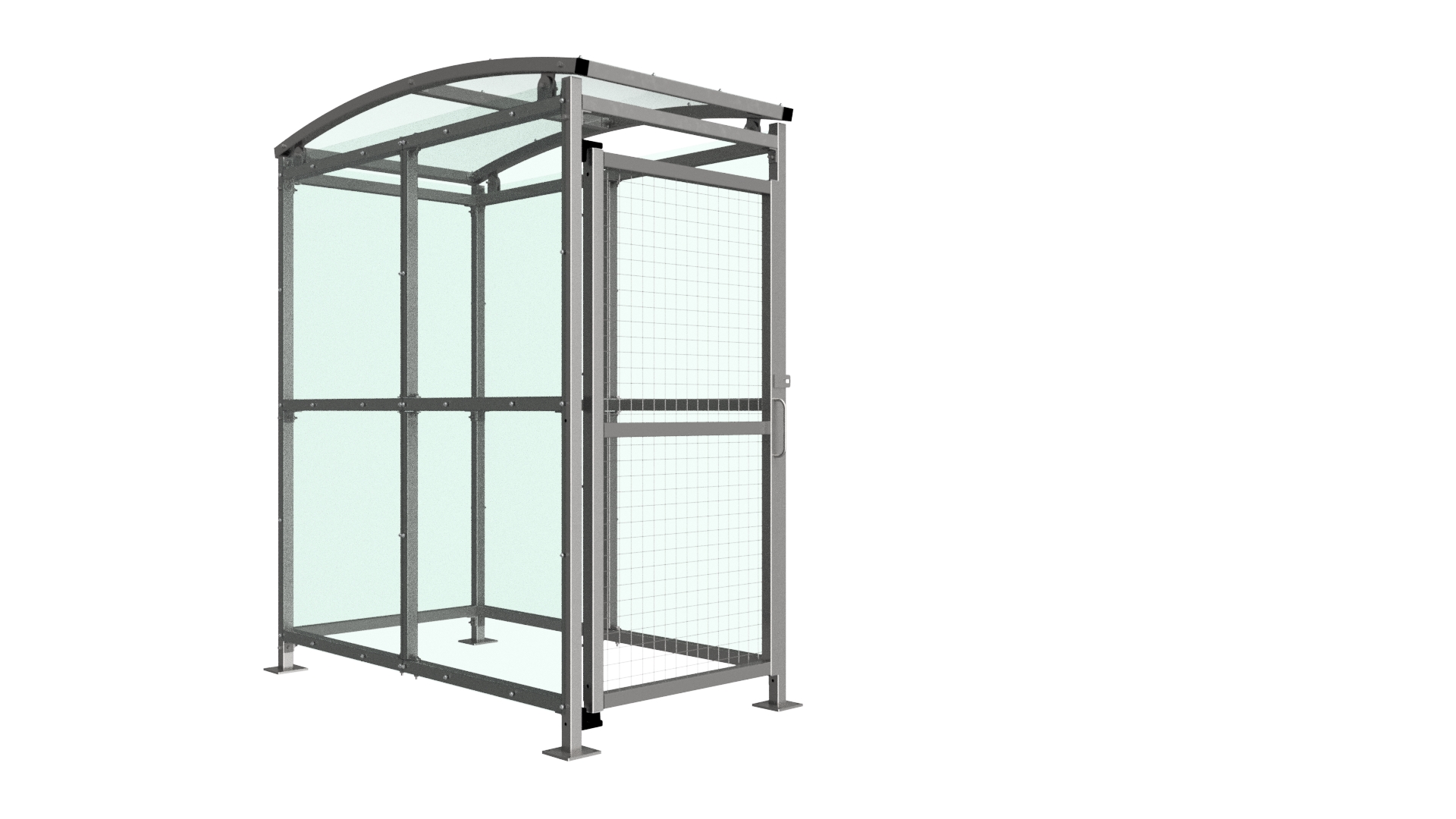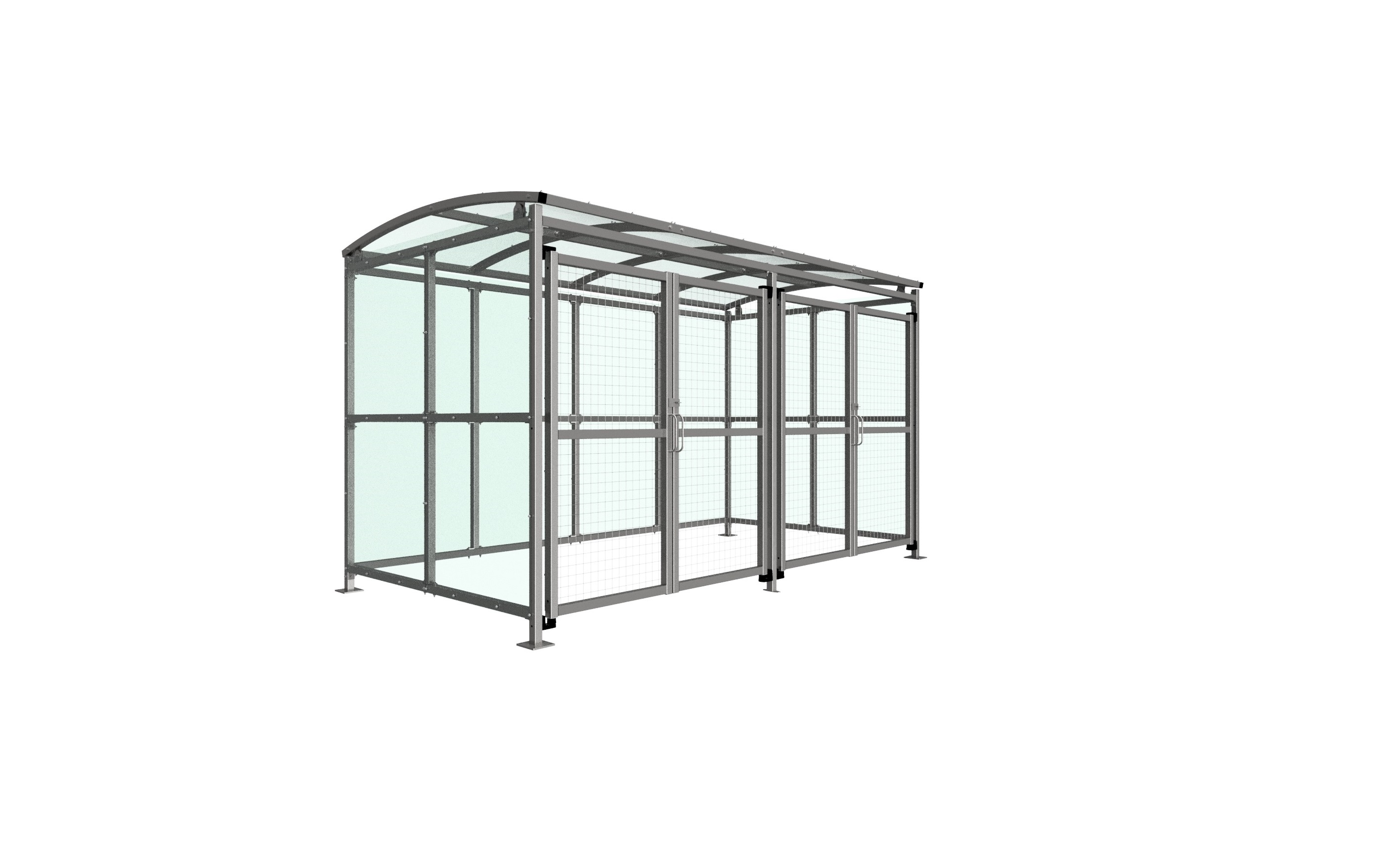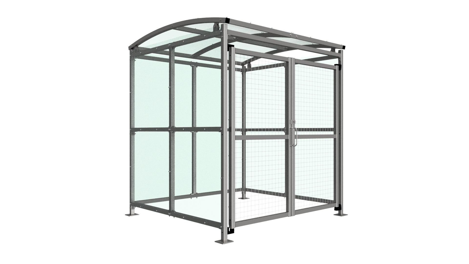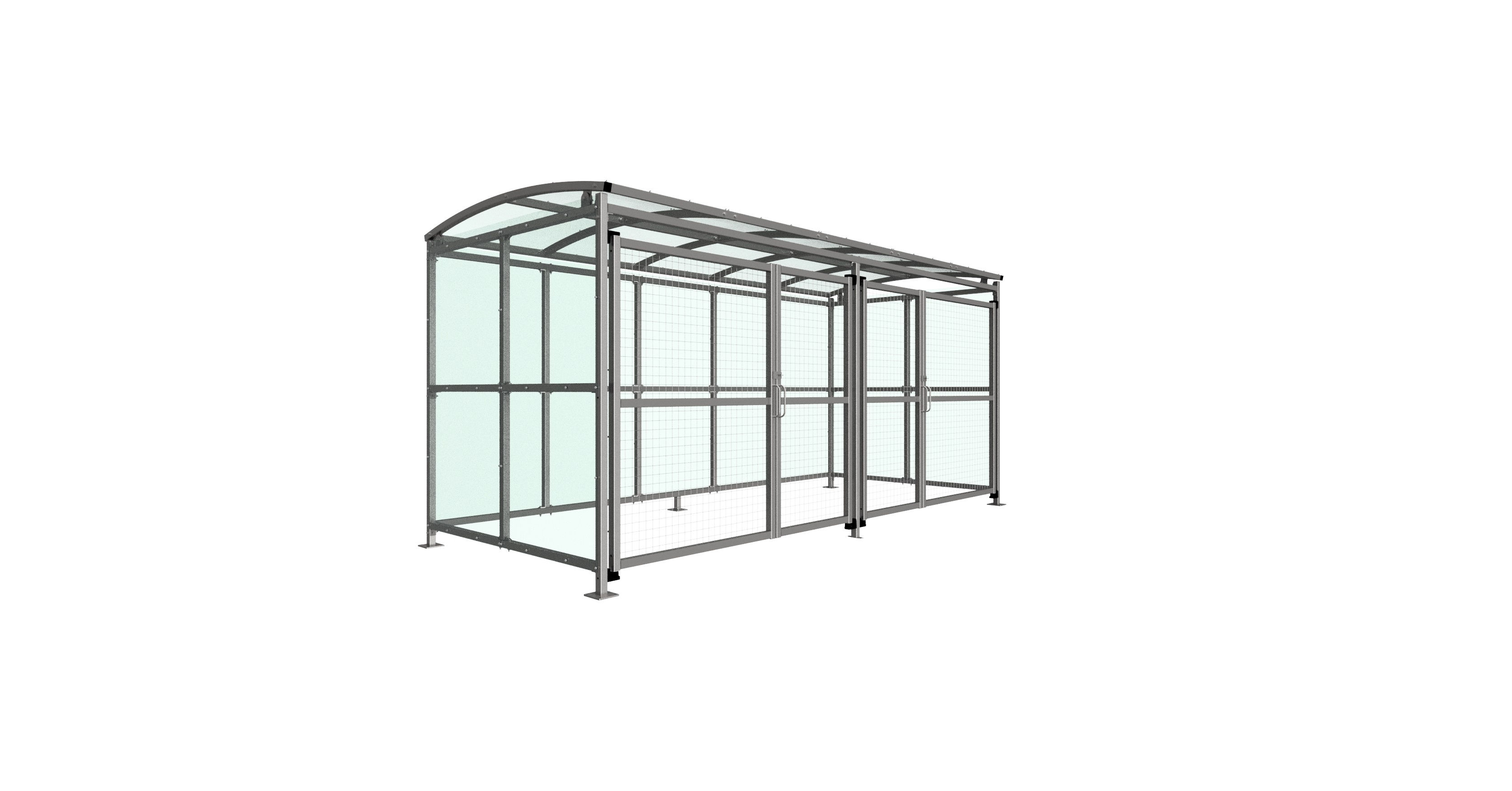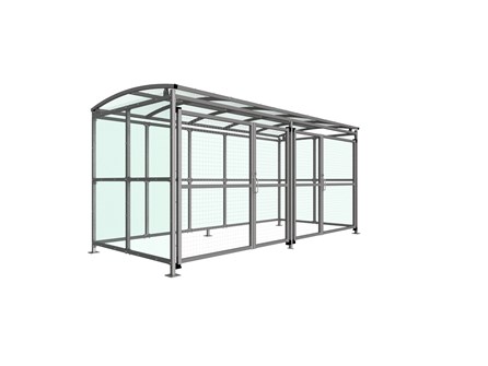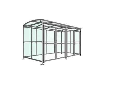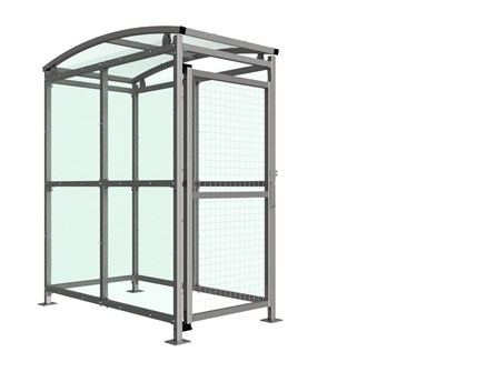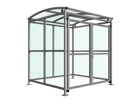 The MC1 variant of the Badby shelter is a free-standing shelter with Mesh Doors lockable by padlock (not included) designed for on site assembly, constructed from galvanised mild steel. Complete with a 4mm PETG clear sheet roof, and side panels. Front-to-back curved roof.