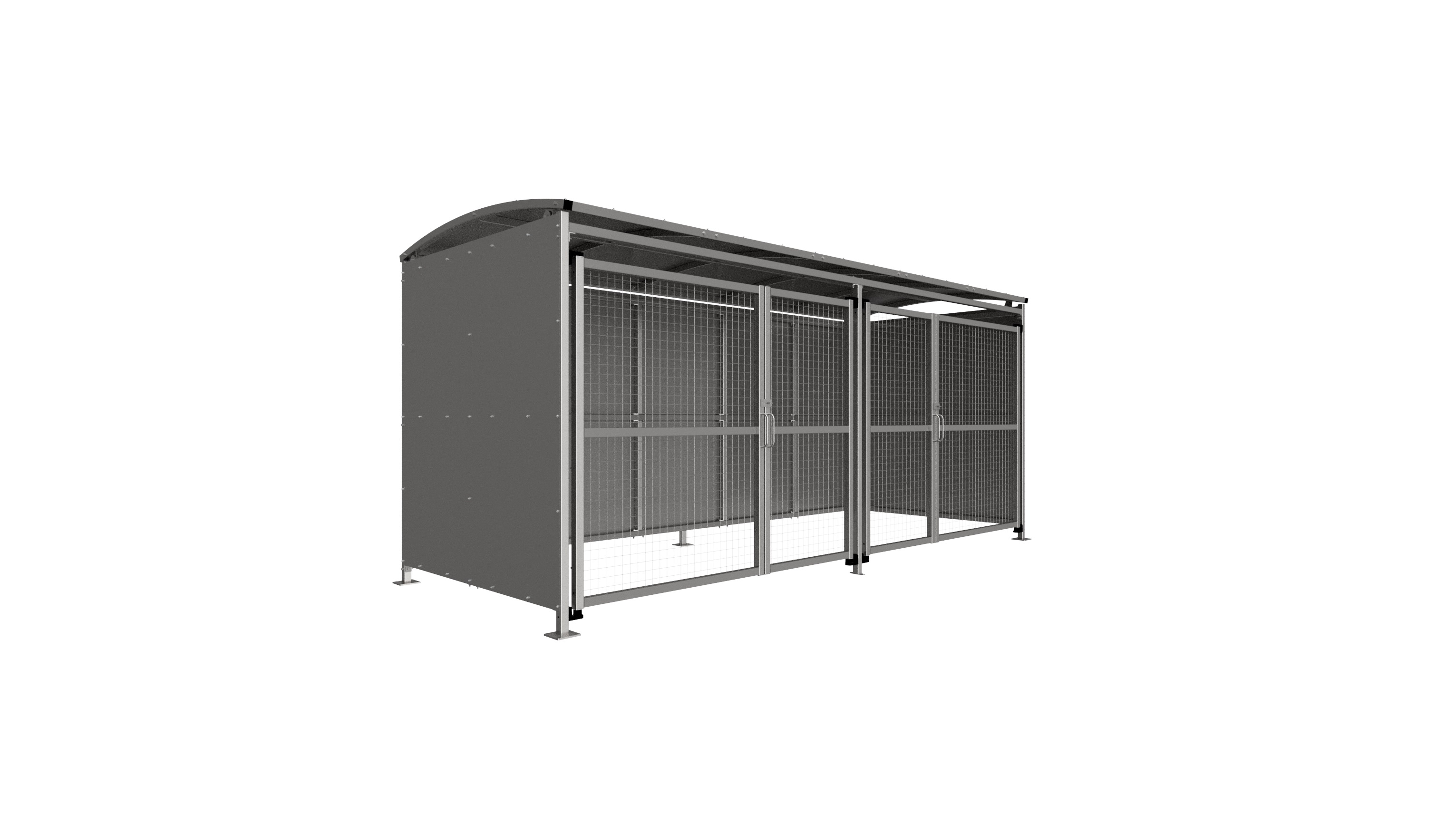 The MM1 variant of the Badby shelter is a free-standing shelter with Mesh Doors lockable by padlock (not included) designed for on site assembly, constructed from galvanised mild steel. Complete with Galvanised sheet roof, and side panels. Front-to-back curved roof.