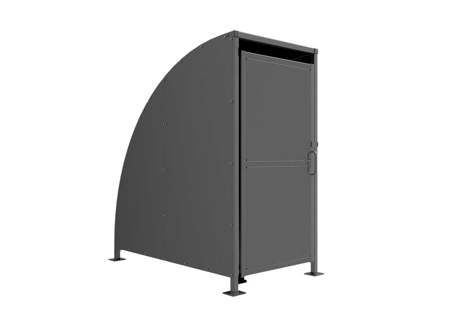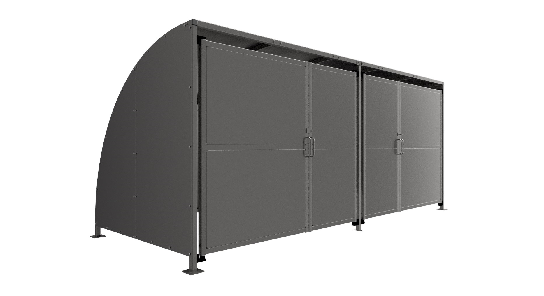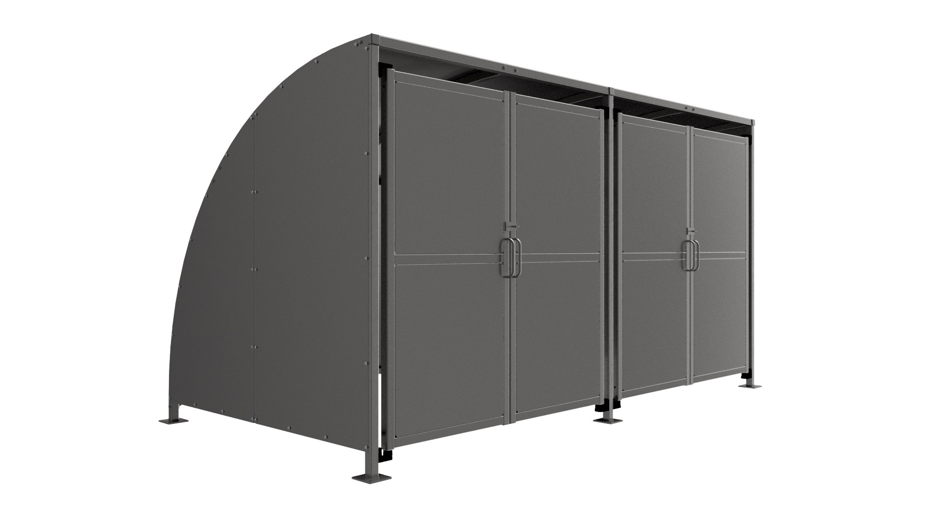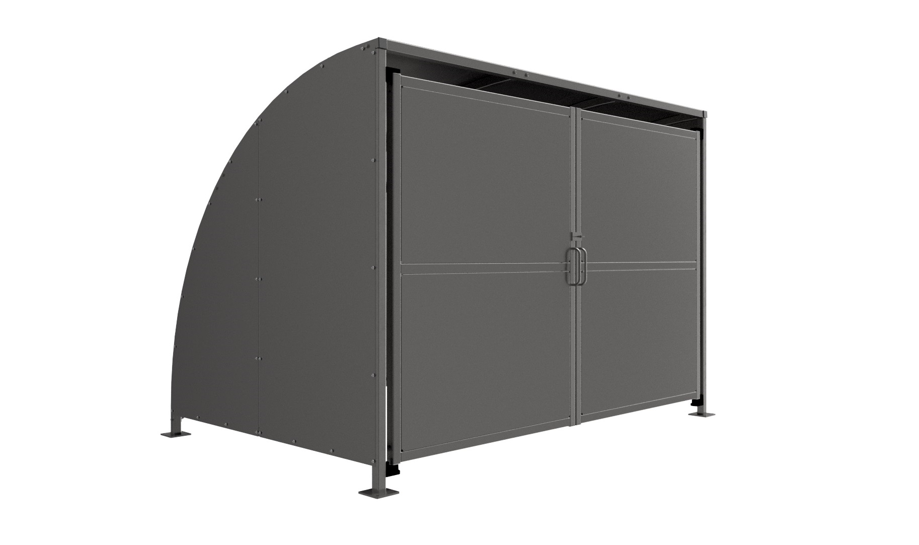 The SG2 variant of the Stratford shelter is a free-standing shelter with Clad Doors lockable by padlock (not included) designed for on site assembly, constructed from galvanised mild steel. Complete Galvanised sheet curved roof and end panels.