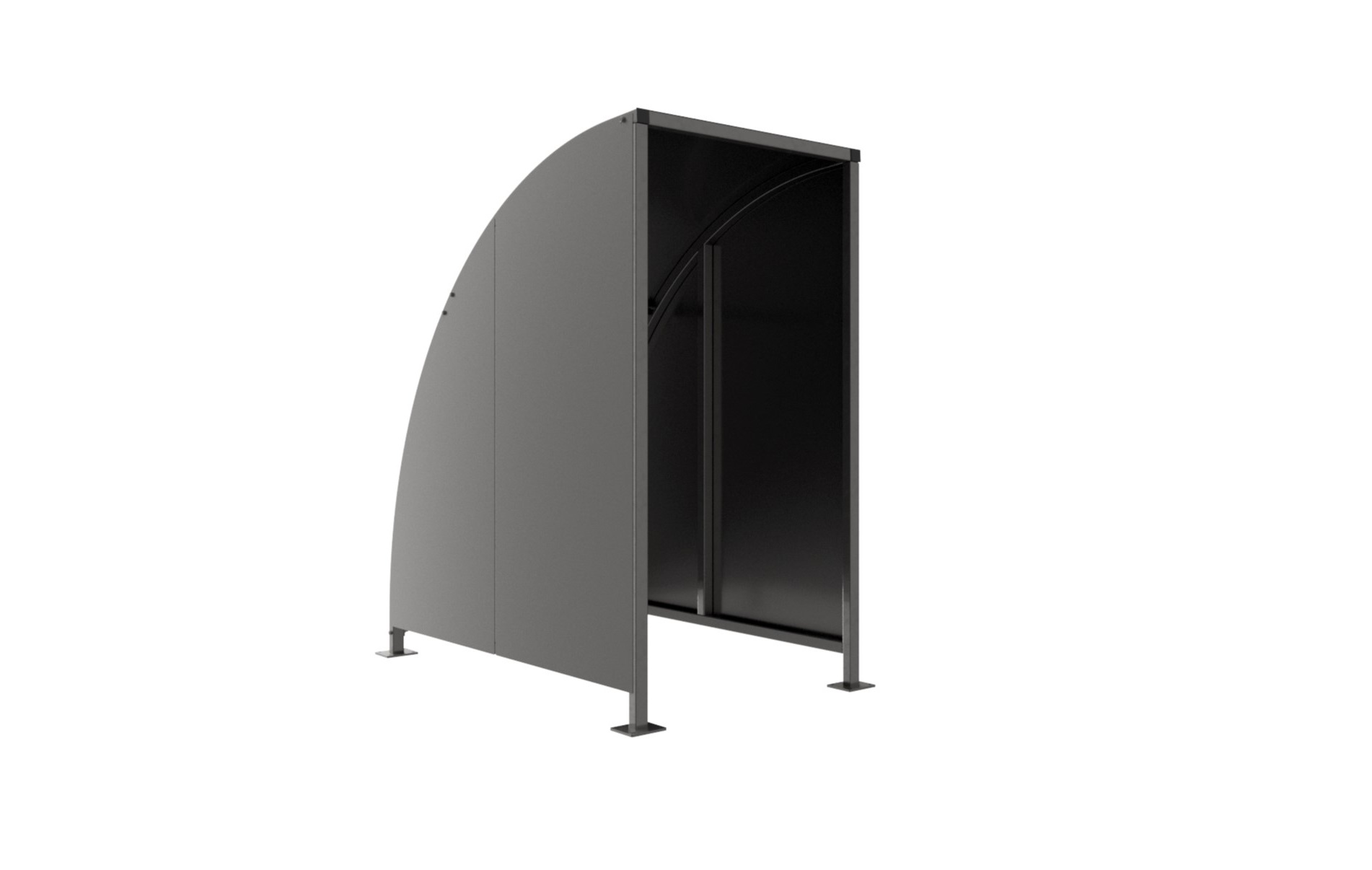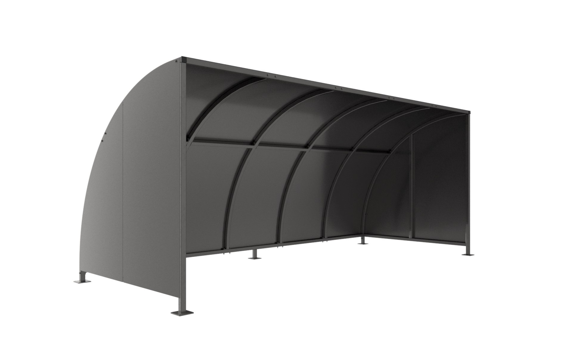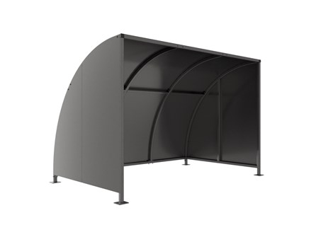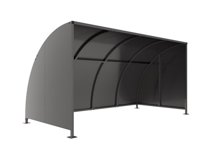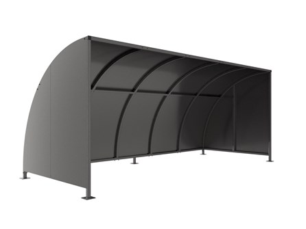 The Stratford shelter is a free-standing, open sided shelter designed for on site assembly, constructed from galvanised mild steel. Complete with a galvanised sheet curved roof and end panels.