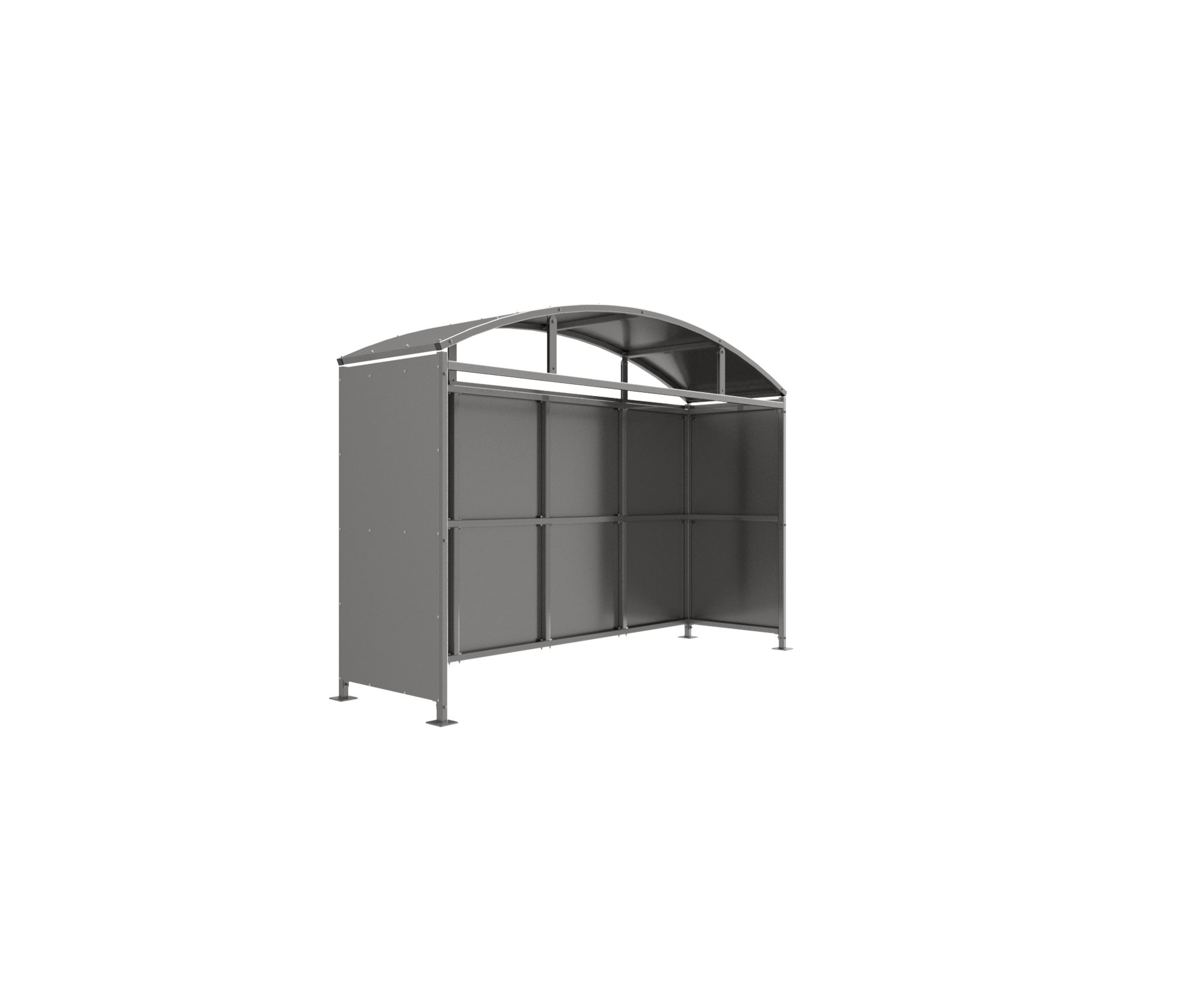 The Welton shelter is a free-standing, open fronted shelter designed for on site assembly, constructed from galvanised mild steel. Complete with galvanised sheet roof, and side panels. Side-to side curved roof.