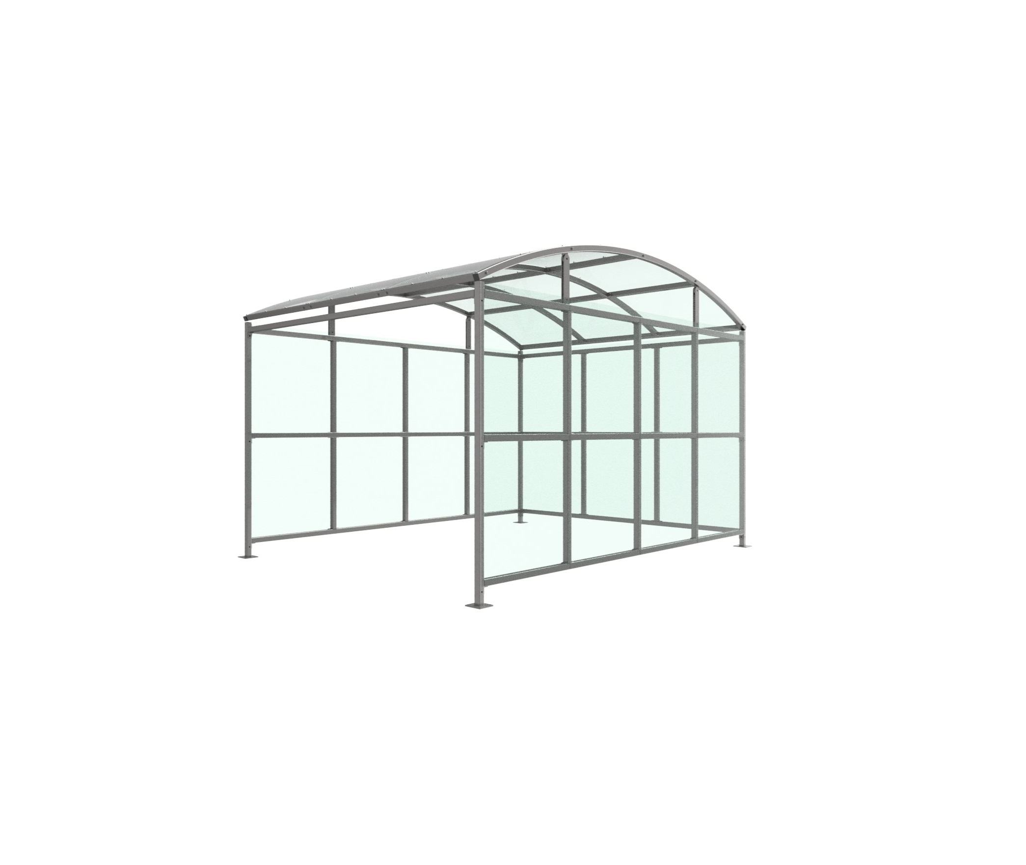 The Wilson shelter is a free-standing, open fronted shelter designed for on site assembly, constructed from galvanised mild steel. Complete with a 4mm PETG clear sheet roof, and side panels. Side-to side curved roof.