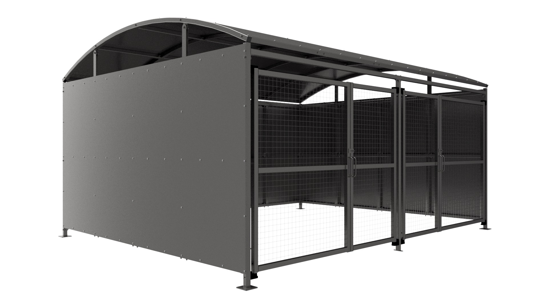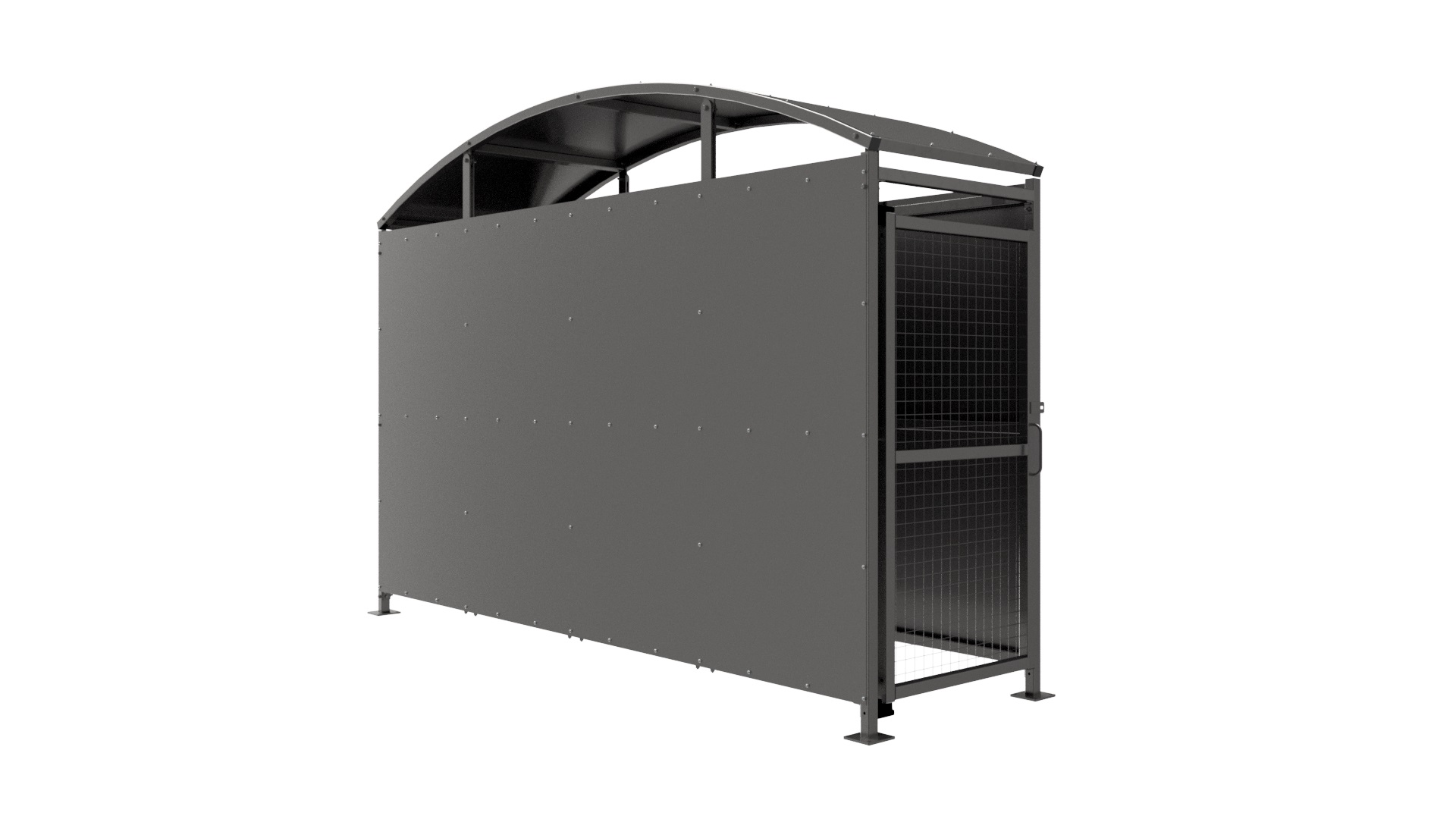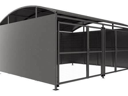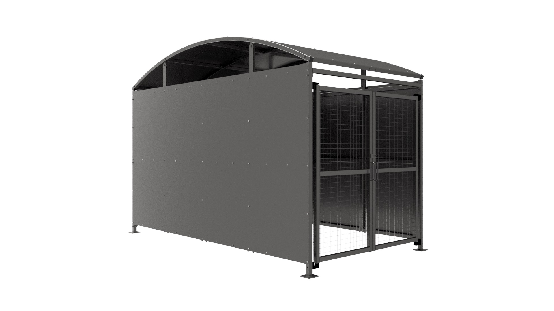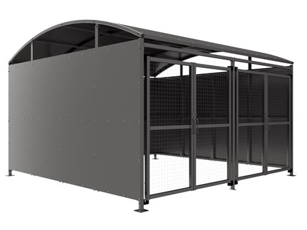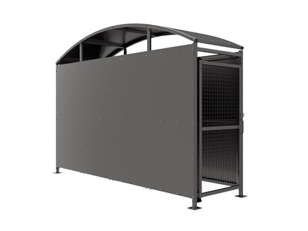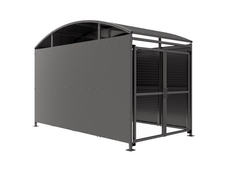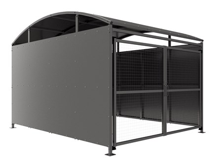 The YM1 variant of the Wilson shelter is a free-standing shelter with Mesh Doors lockable by padlock (not included) designed for on site assembly, constructed from galvanised mild steel. Complete with galvanised sheet roof, and side panels. Side-to side curved roof.