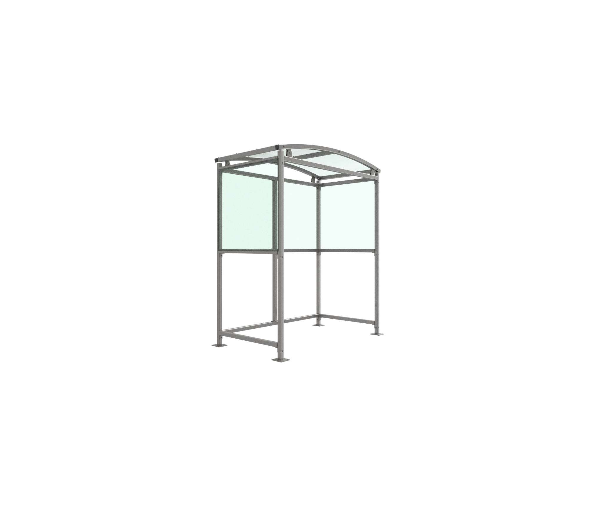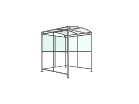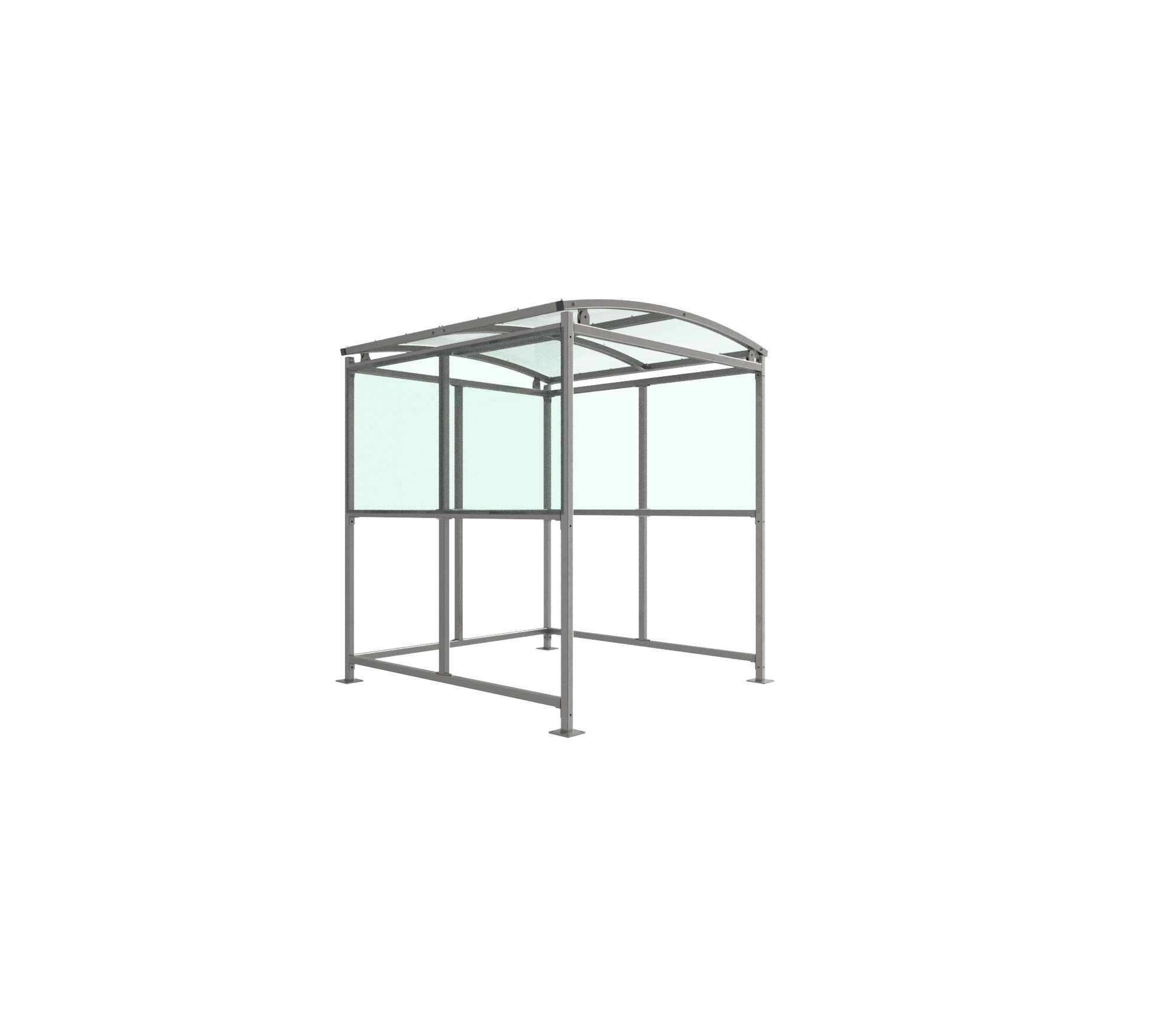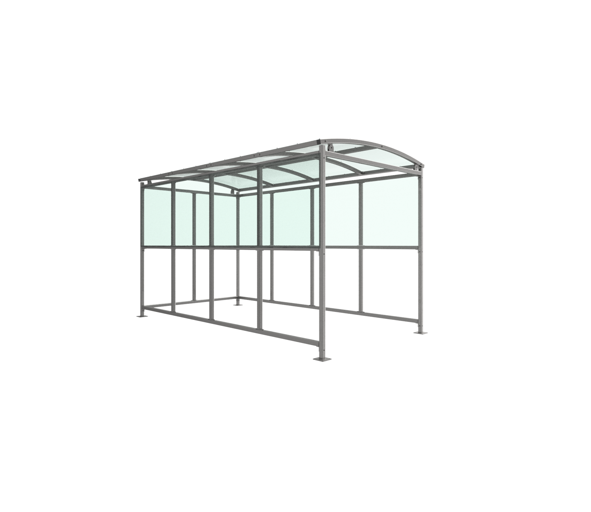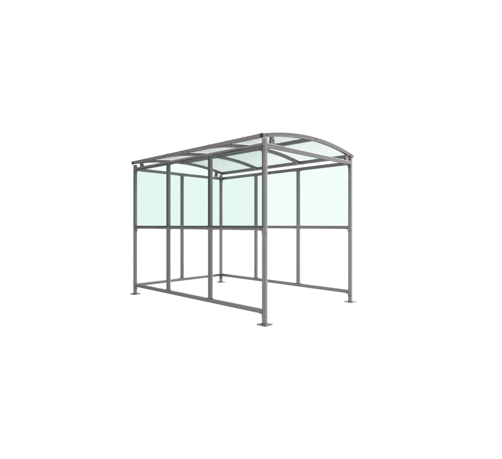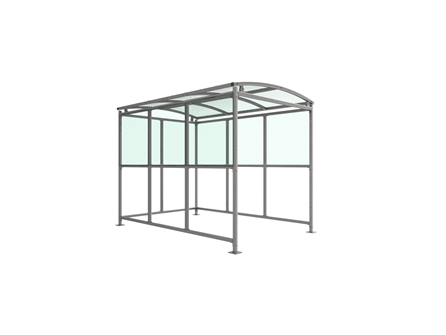 The Burbank shelter is a free-standing, open fronted shelter designed for on site assembly, constructed from galvanised mild steel. Complete with a 4mm PETG clear sheet roof, and ½ side panels. Side-to side curved roof.
