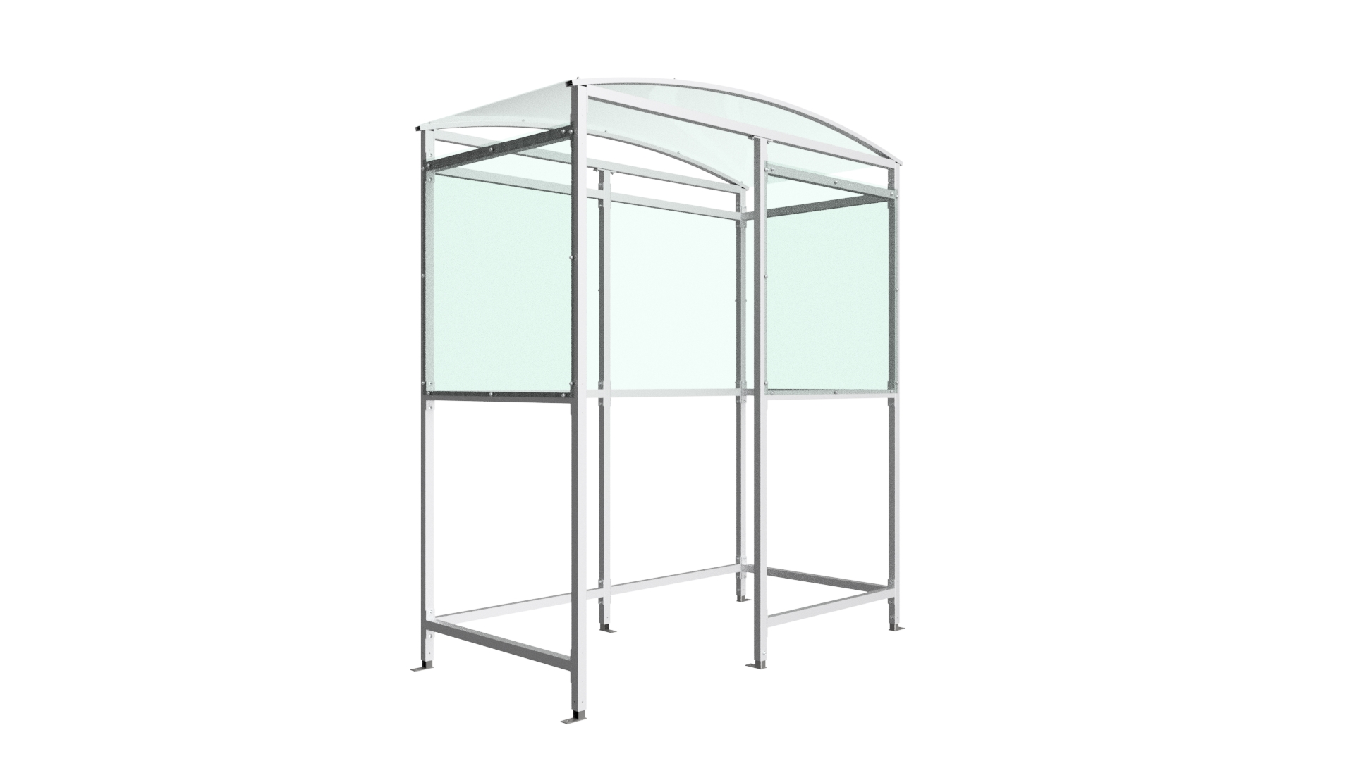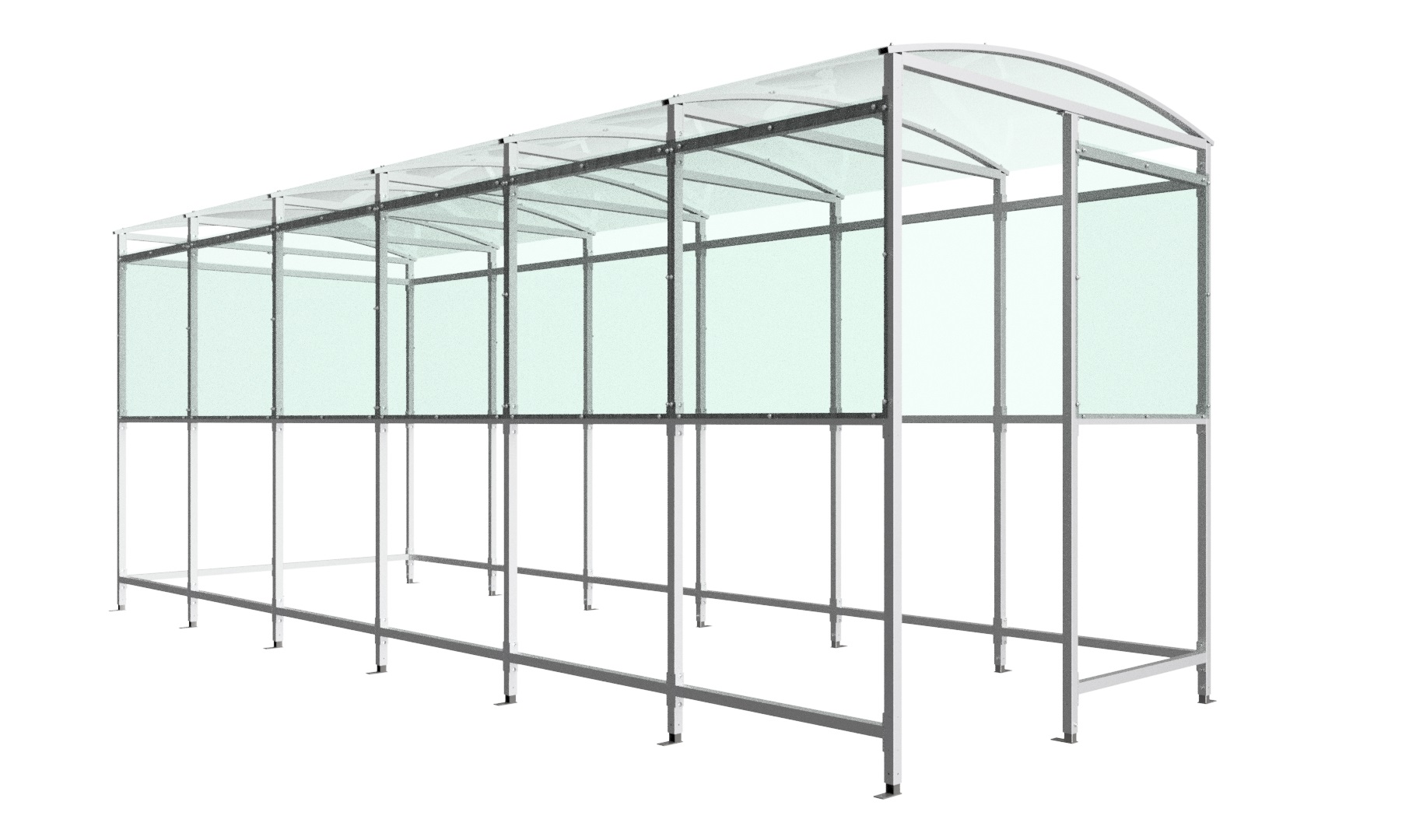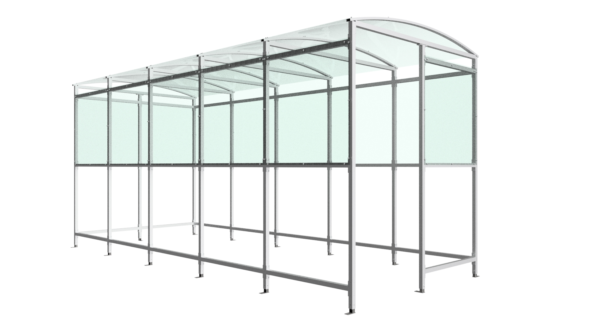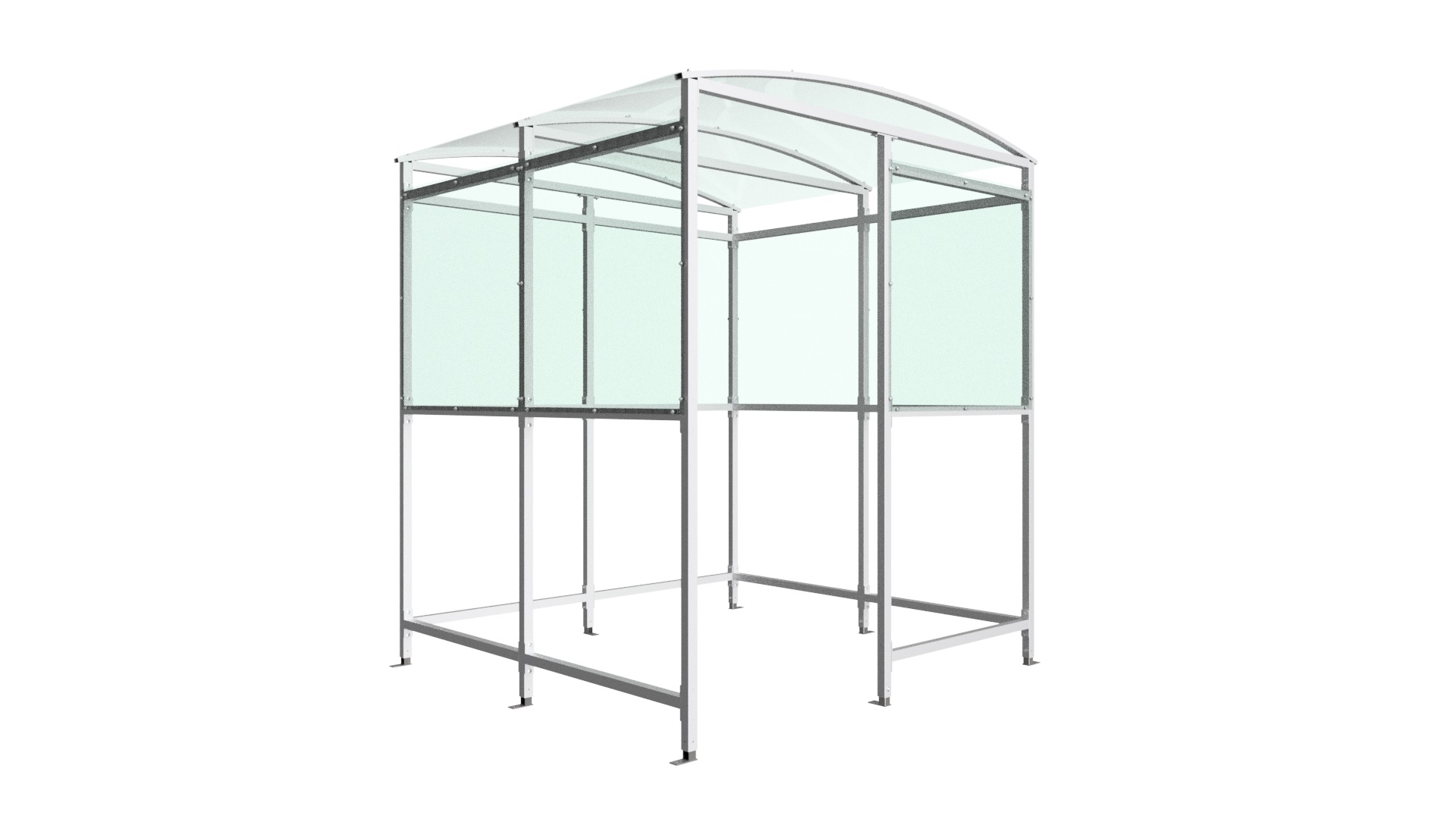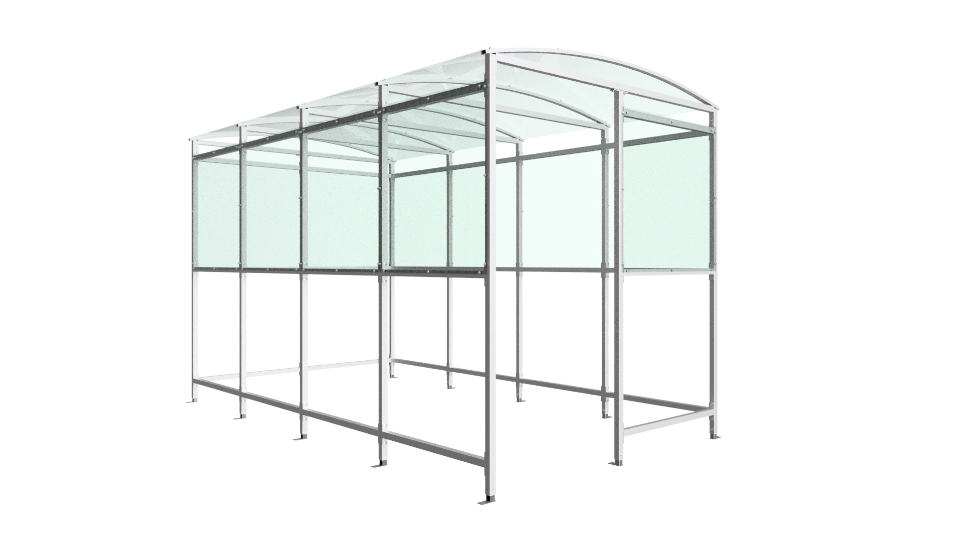 The Cannock shelter is a free-standing, open fronted shelter designed for on site assembly, constructed from aluminium. Complete with a 4mm PETG clear sheet roof, and ½ side panels. Side-to side curved roof. Coated RAL7016 (anthracite grey) as standard, other standard RALs available on request.