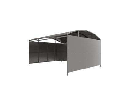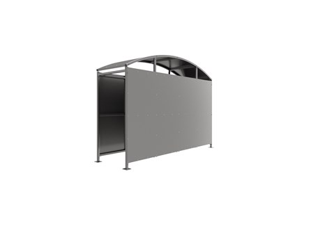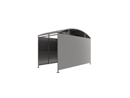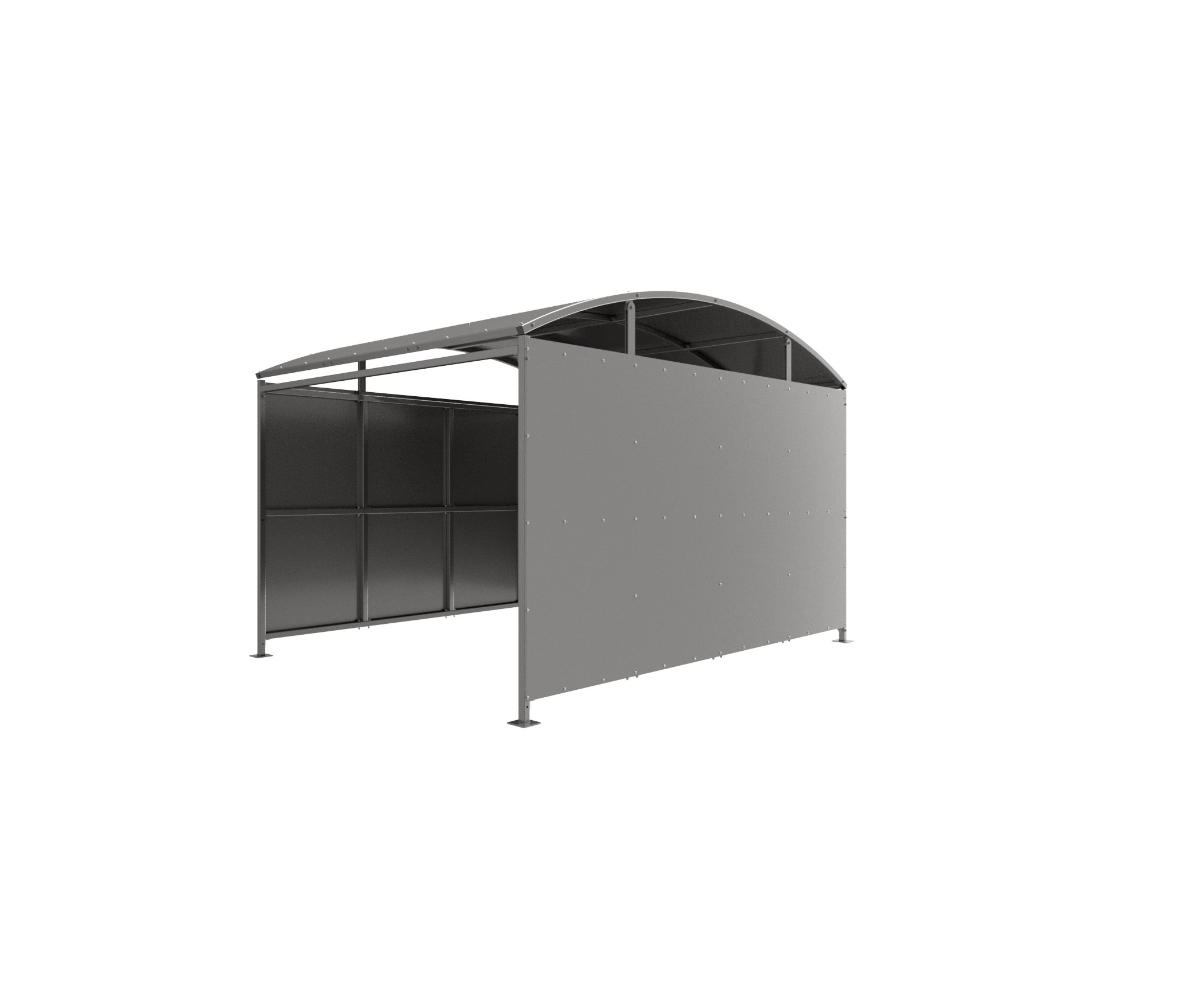 The Wilson shelter is a free-standing, open fronted shelter designed for on site assembly, constructed from galvanised mild steel. Complete with galvanised sheet roof, and side panels. Side-to side curved roof.