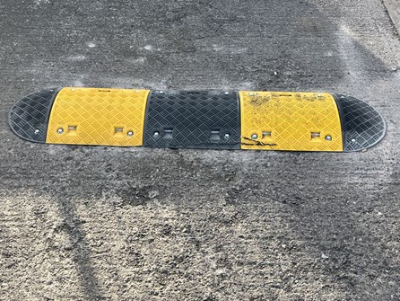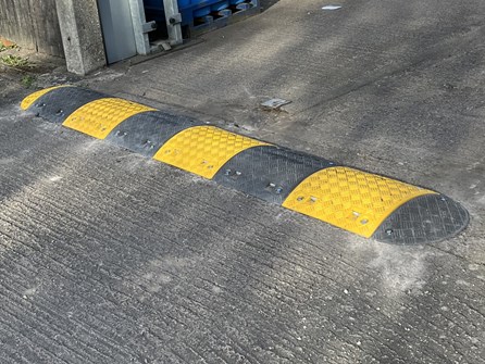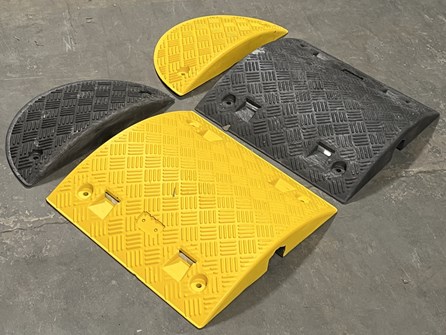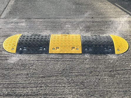 Manufactured from recycled plastic, solid black or painted high visibility yellow. This speed ramp is suitable for wide variety of vehicle types, including heavy goods vehicles with pneumatic tyres up to 40 tonnes. The combination of high contrast black and yellow sections with high visibility reflectors guarantee that the ramp can be seen in even the worst conditions.
