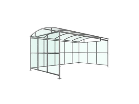 The Dodford shelter is a free-standing, open sided shelter designed for on site assembly, constructed from galvanised mild steel. Complete with a 4mm PETG clear sheet roof, and side panels. Front-to-back curved roof.