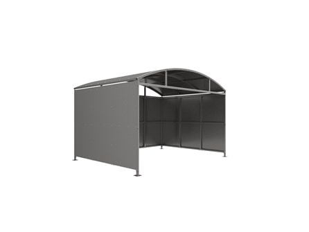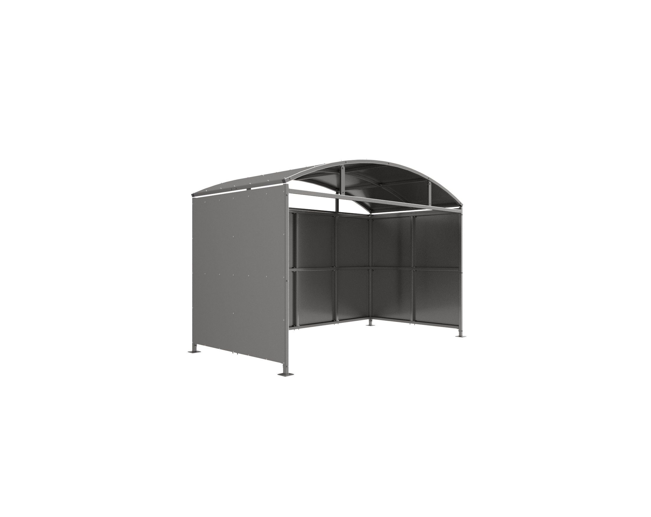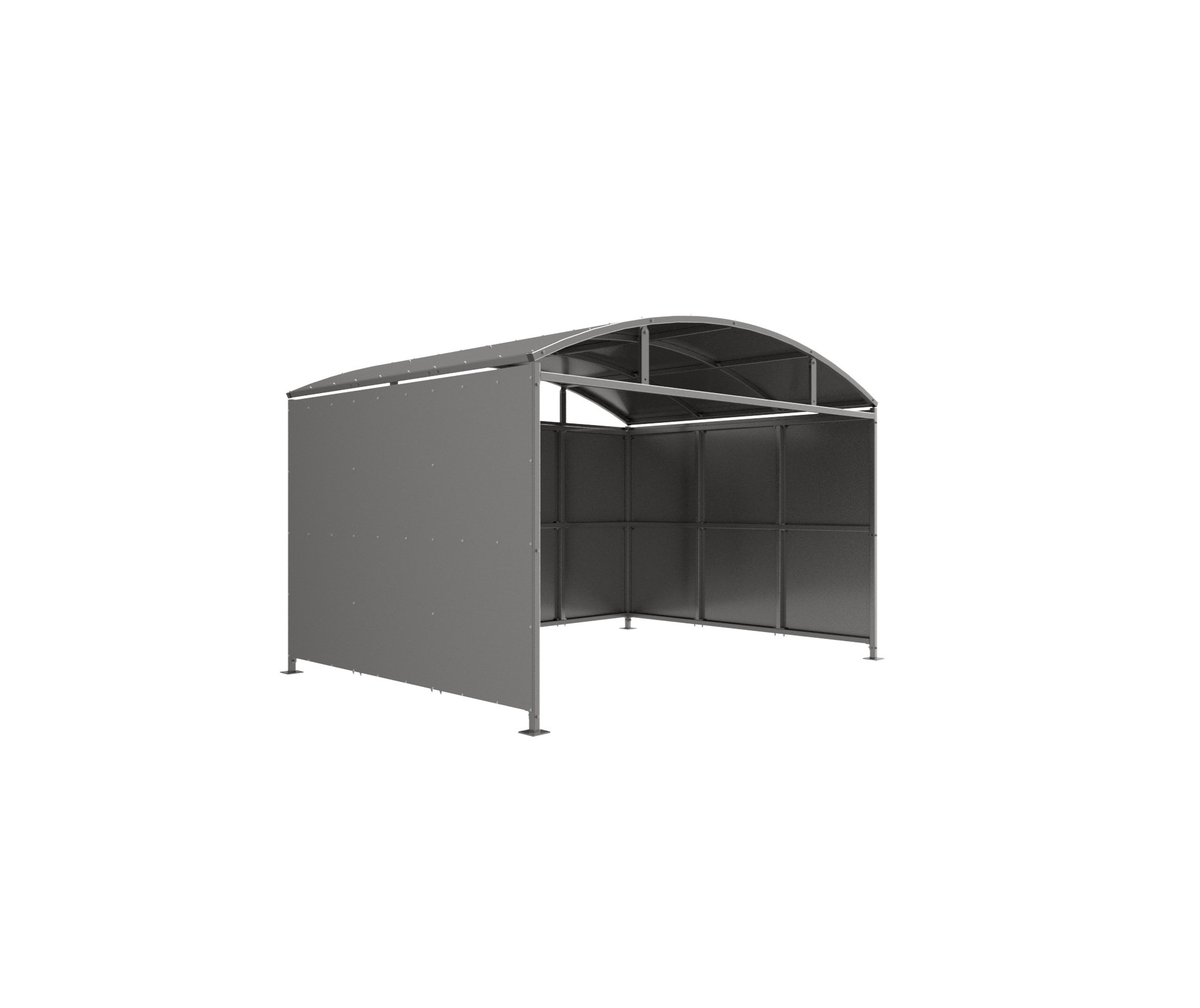 The Welton shelter is a free-standing, open fronted shelter designed for on site assembly, constructed from galvanised mild steel. Complete with galvanised sheet roof, and side panels. Side-to side curved roof.