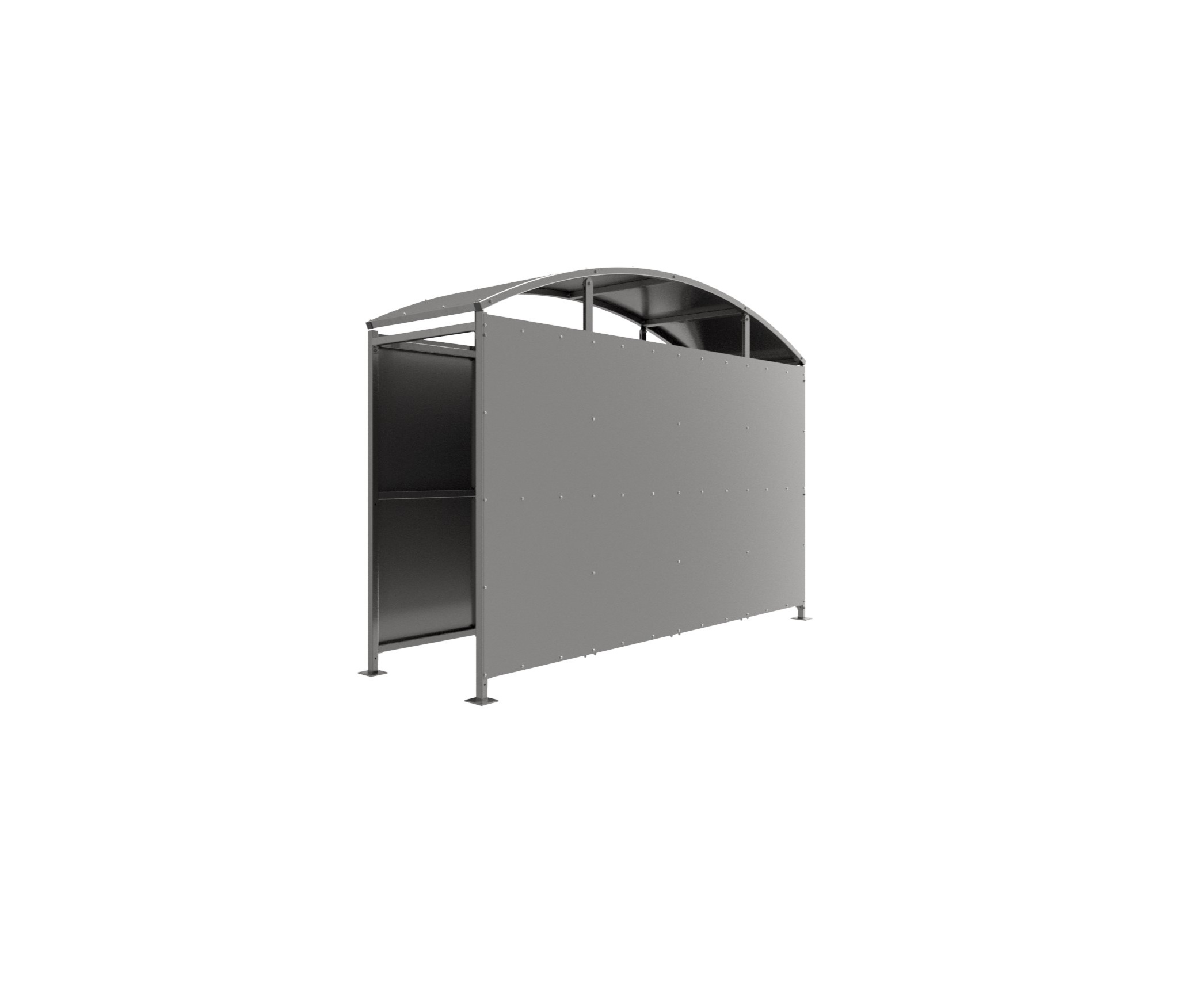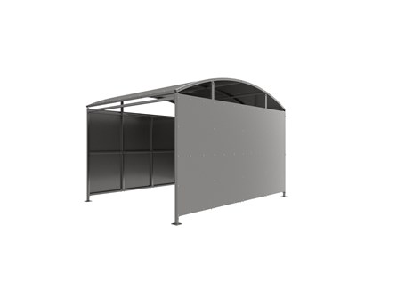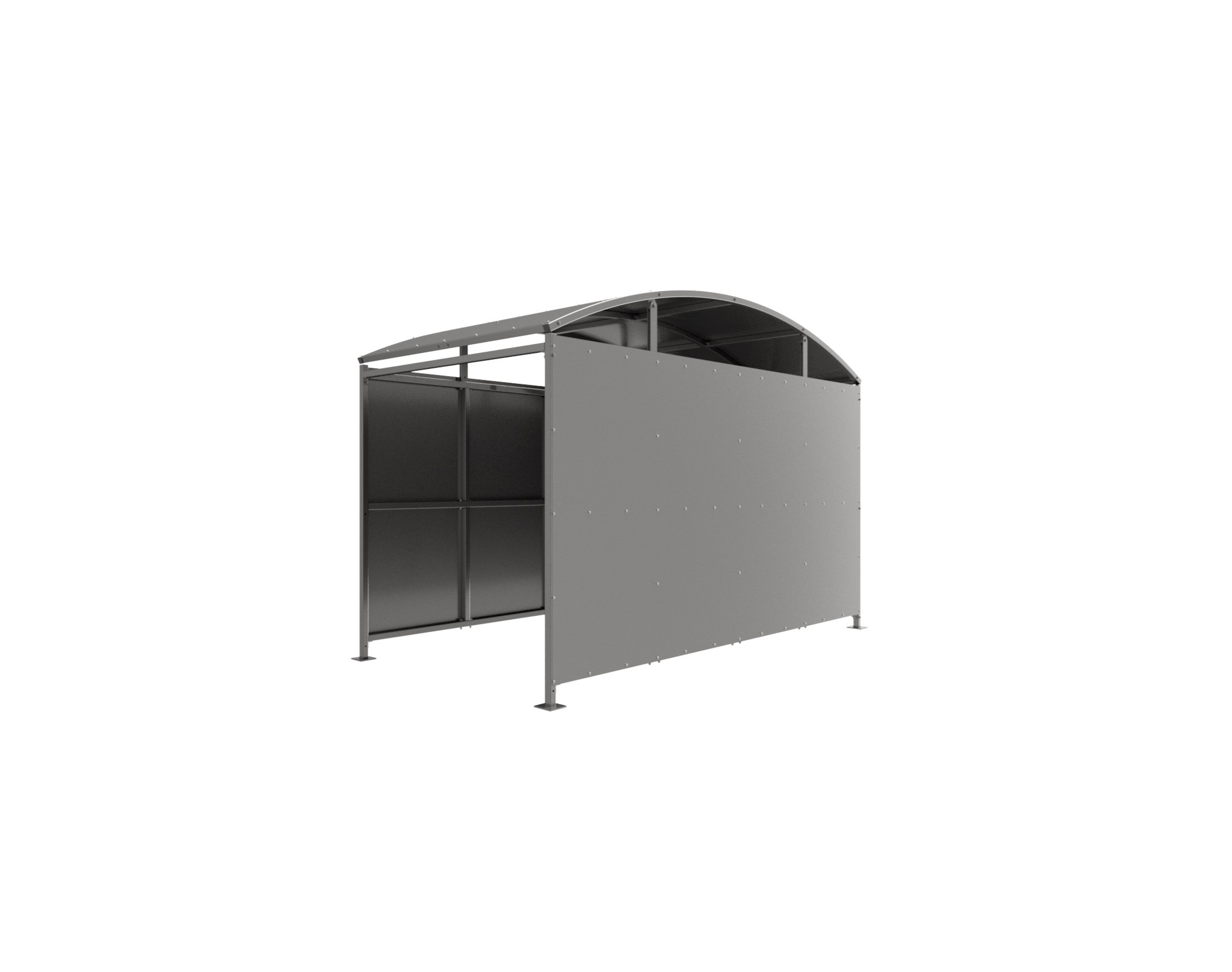 The Wilson shelter is a free-standing, open fronted shelter designed for on site assembly, constructed from galvanised mild steel. Complete with galvanised sheet roof, and side panels. Side-to side curved roof.